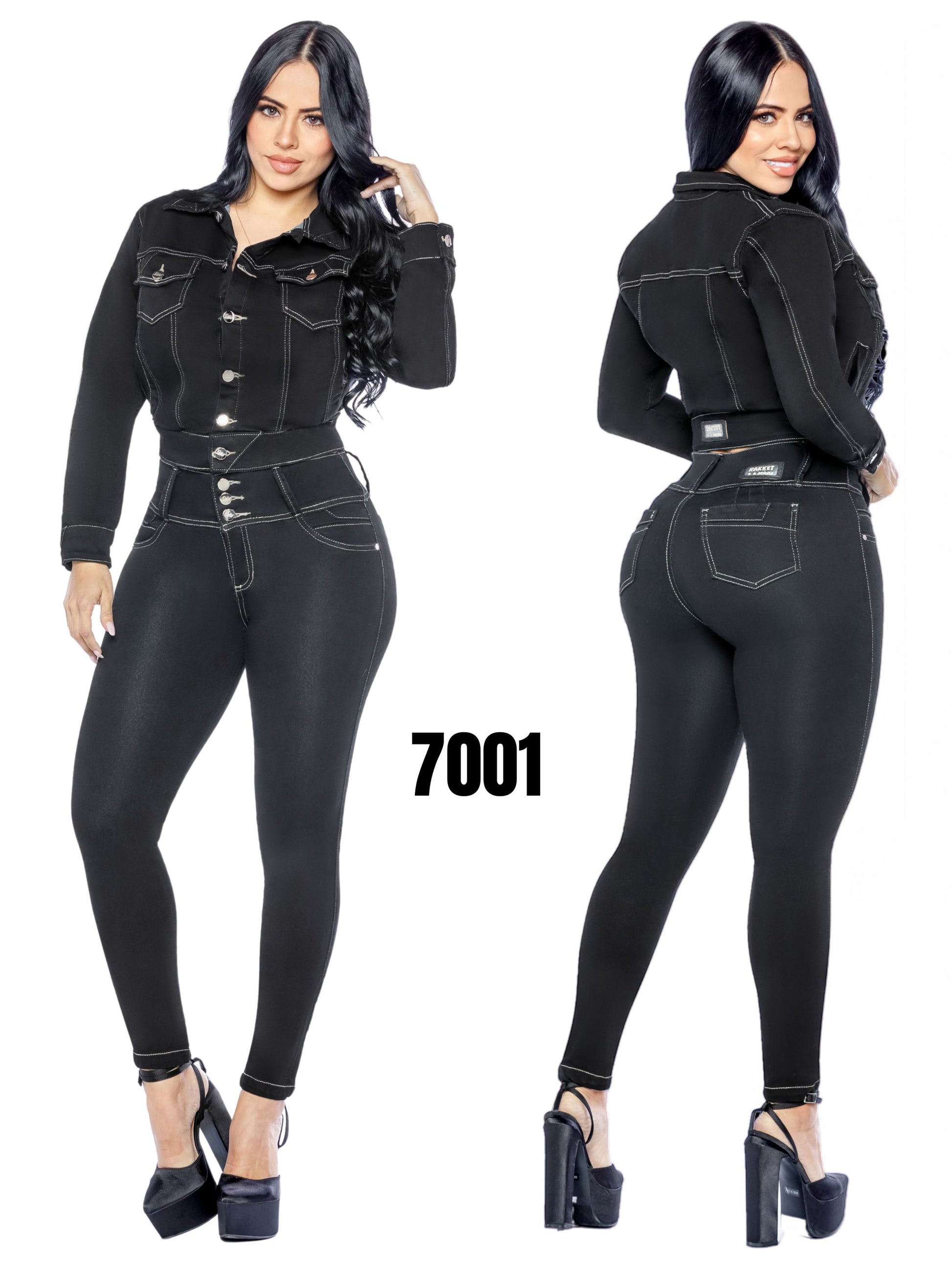 Luce espectacular con este conjunto confeccionado en denim stretch de alta calidad, que se ajusta perfectamente a tu silueta brindando comodidad y estilo todo el día.