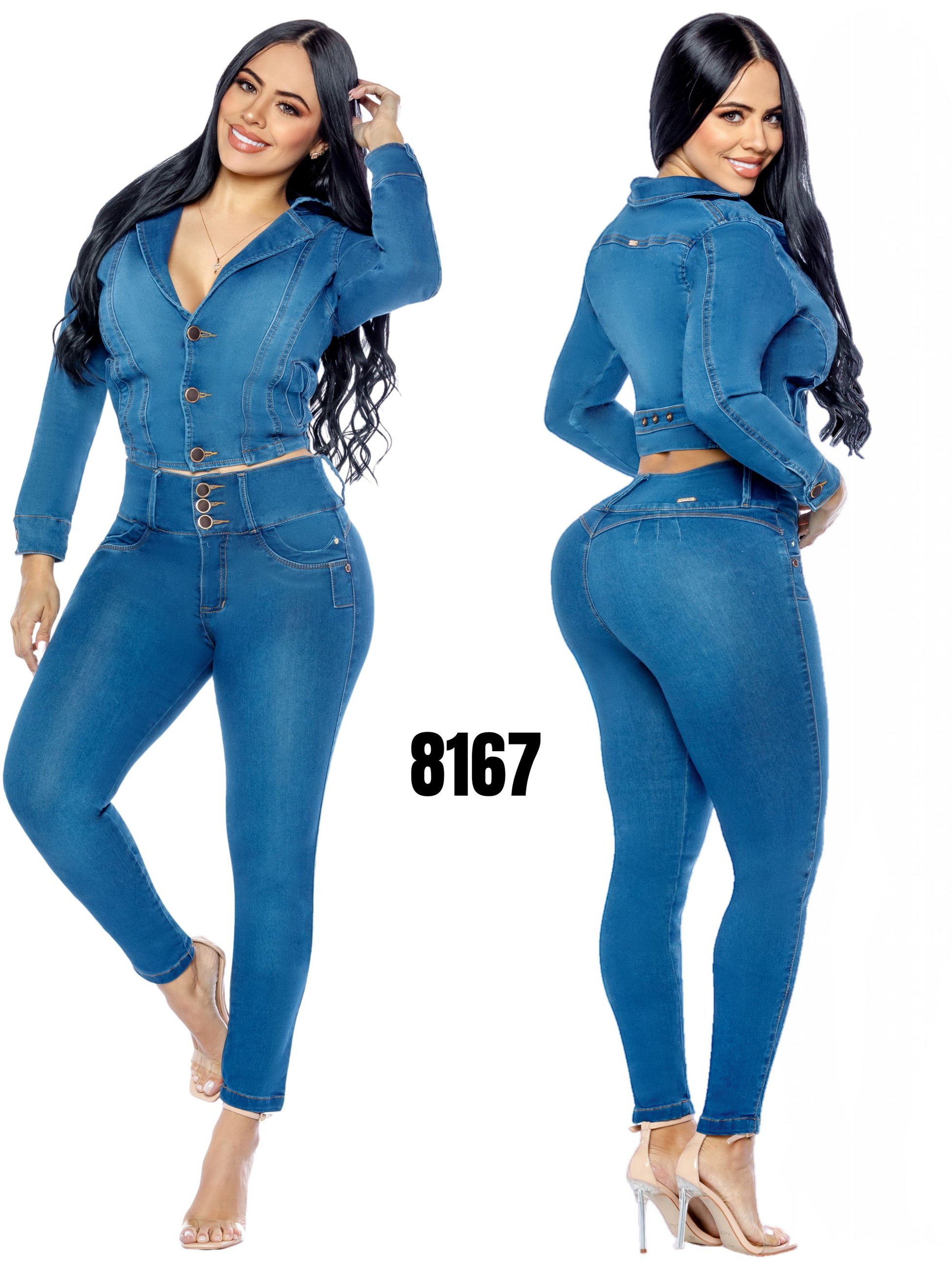Luce espectacular con este conjunto confeccionado en denim stretch de alta calidad, que se ajusta perfectamente a tu silueta brindando comodidad y estilo todo el día.